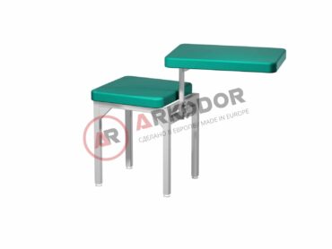 Стул для внутривенных вливаний с поднимающимся и поворачивающимся столиком. Столик в выбранном положении фиксируется двумя зажимами.